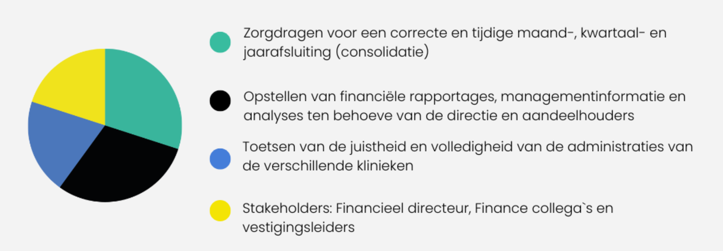 De functie is breed en afwisselend. Tot de taken behoren de maand-, kwartaal- en jaarafsluitingen (inclusief consolidatie), het opstellen van rapportages, managementinformatie en analyses voor directie en aandeelhouders, en het toetsen van de juistheid van de administraties van de verschillende klinieken. Het maken van aansluitingen tussen boekhoudsystemen, het EPD (Elektronisch Patiënten Dossier) en de salarisadministratie vraagt om oog voor detail en procesmatig inzicht.