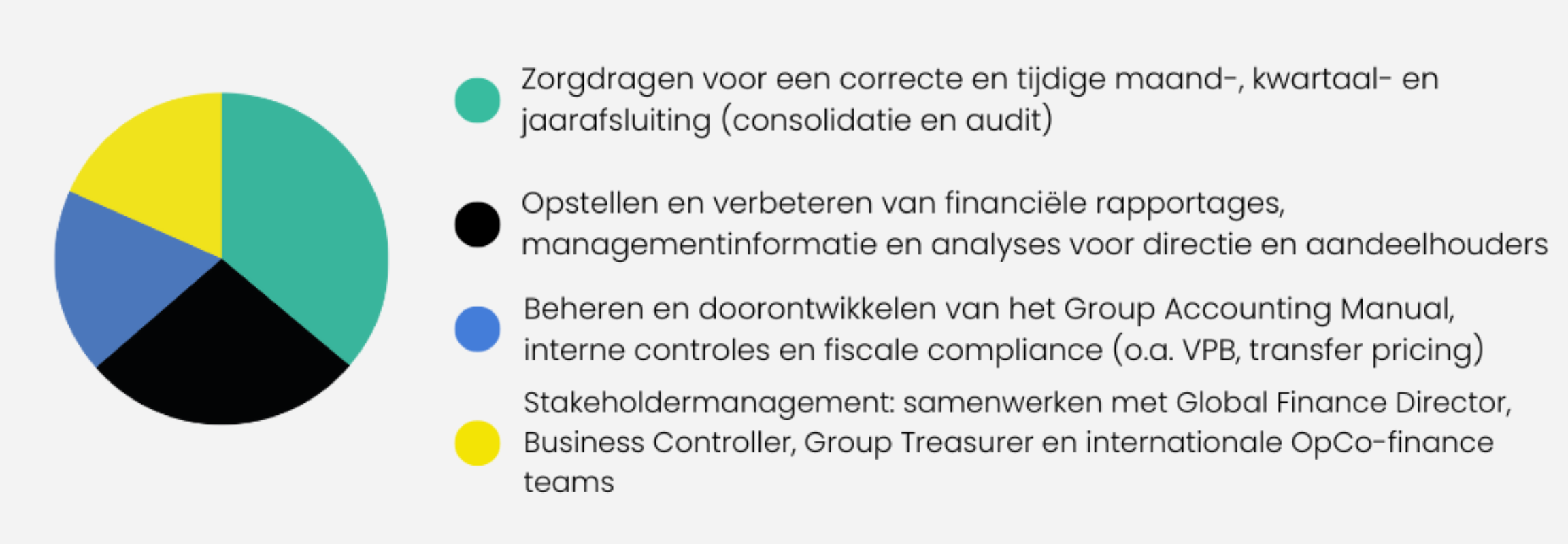De Financial Controller levert betrouwbare stuurinformatie aan directie en management, ondersteunt bij strategische besluitvorming en draagt bij aan de verdere professionalisering van de financiële organisatie. De functie is breed en afwisselend. Tot de taken behoren de maand-, kwartaal- en jaarafsluitingen, het opstellen van geconsolideerde rapportages en jaarrekeningen, en het onderhouden van het Group Accounting Manual en het zorgdragen voor een soepel en efficiënt afsluitingsproces op de Holding en in de OpCos. Ook de coördinatie van audits en het onderhouden van contacten met externe accountants behoren tot het takenpakket.
