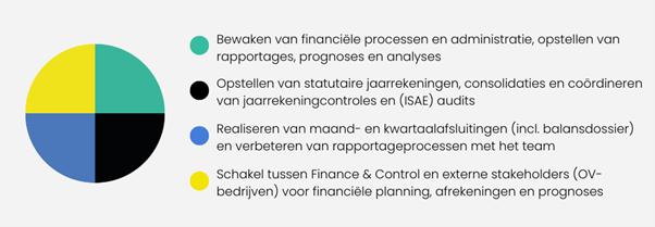 Je rapporteert aan de Manager Financial Control en werkt in een team van 8 collega’s, waarvan 2 Financial Controllers. Samen met je collega’s ga je aan de slag om de maand- en kwartaalafsluitingen (inclusief het balansdossier) op een effectieve manier en tegen hoge kwaliteit te realiseren. Ook ben je de schakel tussen Finance & Control van Translink en (de financiële collega’s van) onze externe stakeholders (OV-bedrijven) op het gebied van financiële planning, afrekeningen en prognoses.