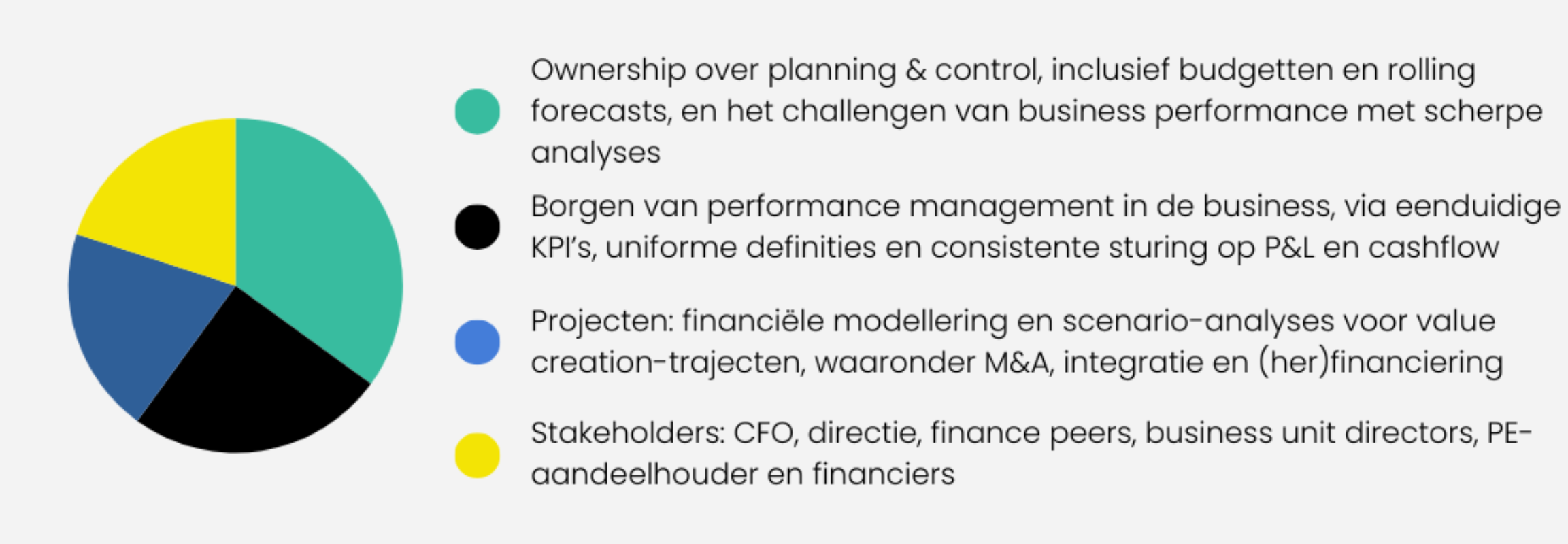 Je neemt verantwoordelijkheid voor de voorspelbaarheid van budgetten en forecasts en voor helder inzicht in performance per business unit. Je onderbouwt keuzes richting CFO en directie met scherpe analyses van resultaatontwikkeling, cashflow en de financiële impact van operationele beslissingen.