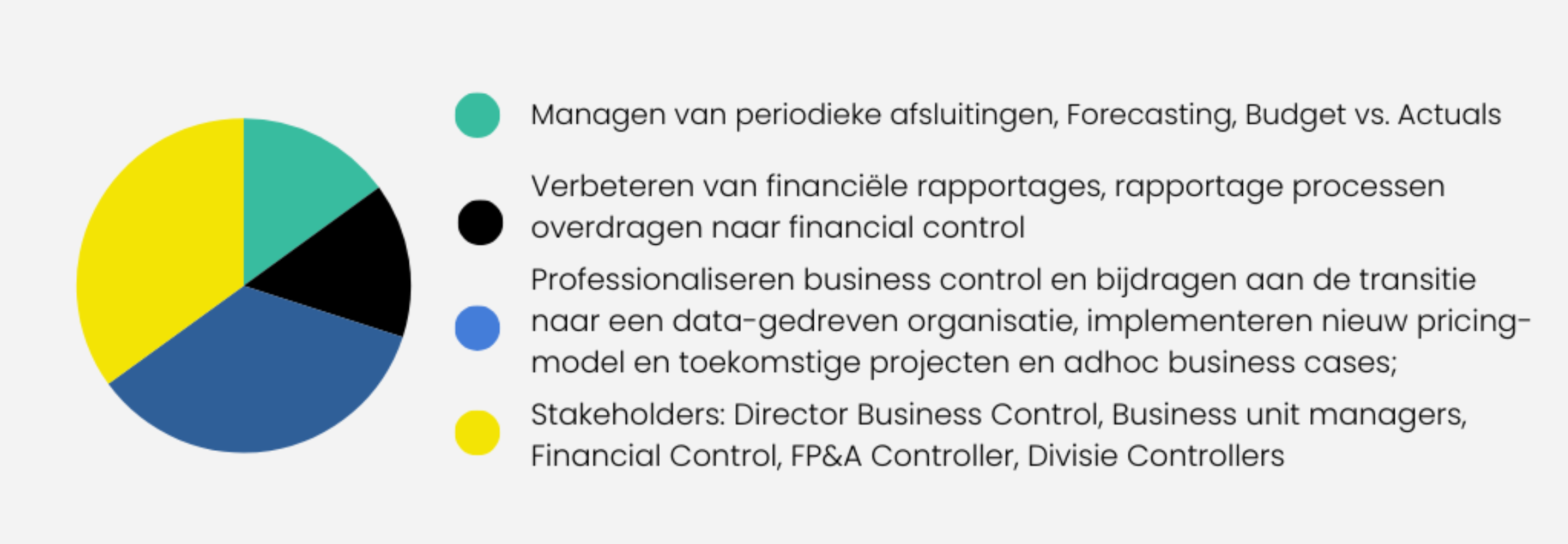 Je houdt je bezig met de analyse van cijfers in de maandafsluiting en het opstellen van forecasts, meerjarenplan en budget en zorgt dat business units tijdig inzicht hebben in hun prestaties. Finance is centraal georganiseerd en bedient alle business units vanuit één team, waardoor jij een belangrijke schakel bent tussen divisiecontroller en business. Je begeleidt business units actief, sluit bij grotere units aan bij het managementteam en neemt hen mee in het begrijpen en gebruiken van financiële informatie. In deze rol verschuift de focus geleidelijk van rapporteren naar waarde toevoegen. Circa dertig procent van je tijd besteed je aan forecasts en het analyseren van actuals versus budget. Je speelt een actieve rol in het overdragen van rapportages aan Financial Control en BI, zodat Business Control zich kan ontwikkelen tot een strategische partner binnen de organisatie.