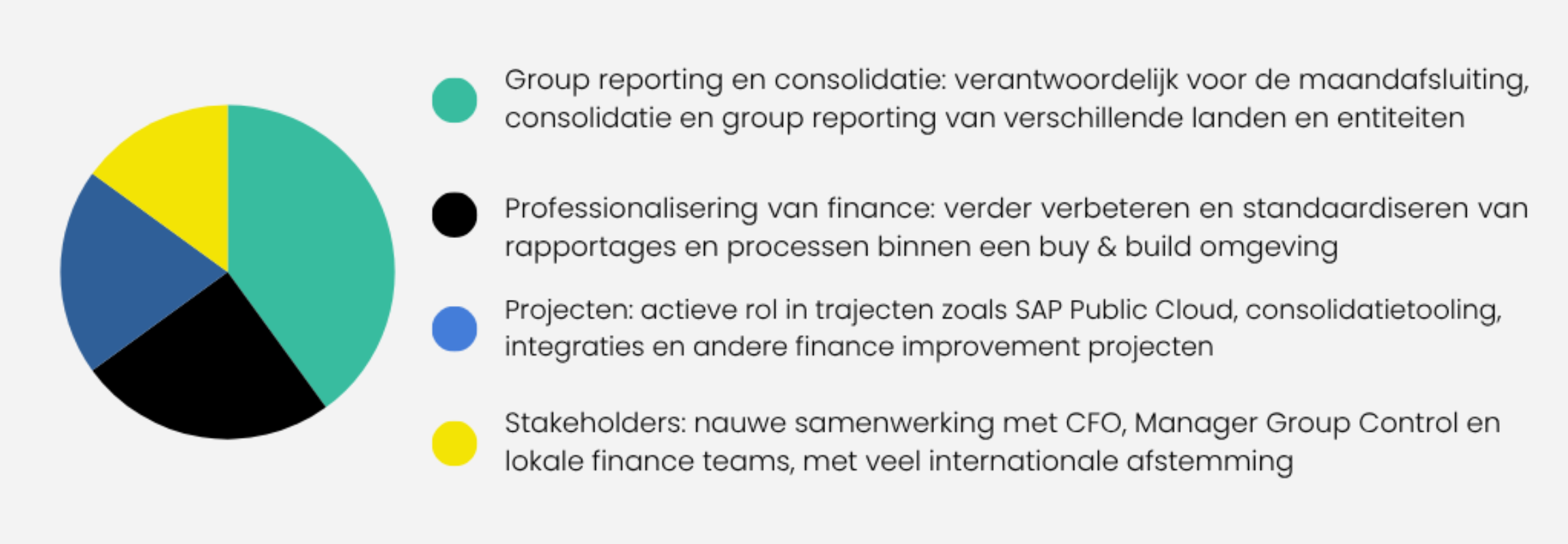 De kern van de rol ligt allereerst bij group reporting en technische consolidatie. Je zorgt dat groepsrapportages, analyses en reconciliaties tijdig, juist en bruikbaar zijn en helpt tegelijk om de kwaliteit ervan verder te verhogen. Dat betekent dat je niet alleen uitvoert, maar ook kritisch kijkt naar hoe dingen slimmer, consistenter en beter schaalbaar kunnen worden ingericht. Denk aan processen tussen de verschillende entiteiten, maand- en jaarafsluitingen, rapportagestructuren en de verdere inrichting van de consolidatiekant.