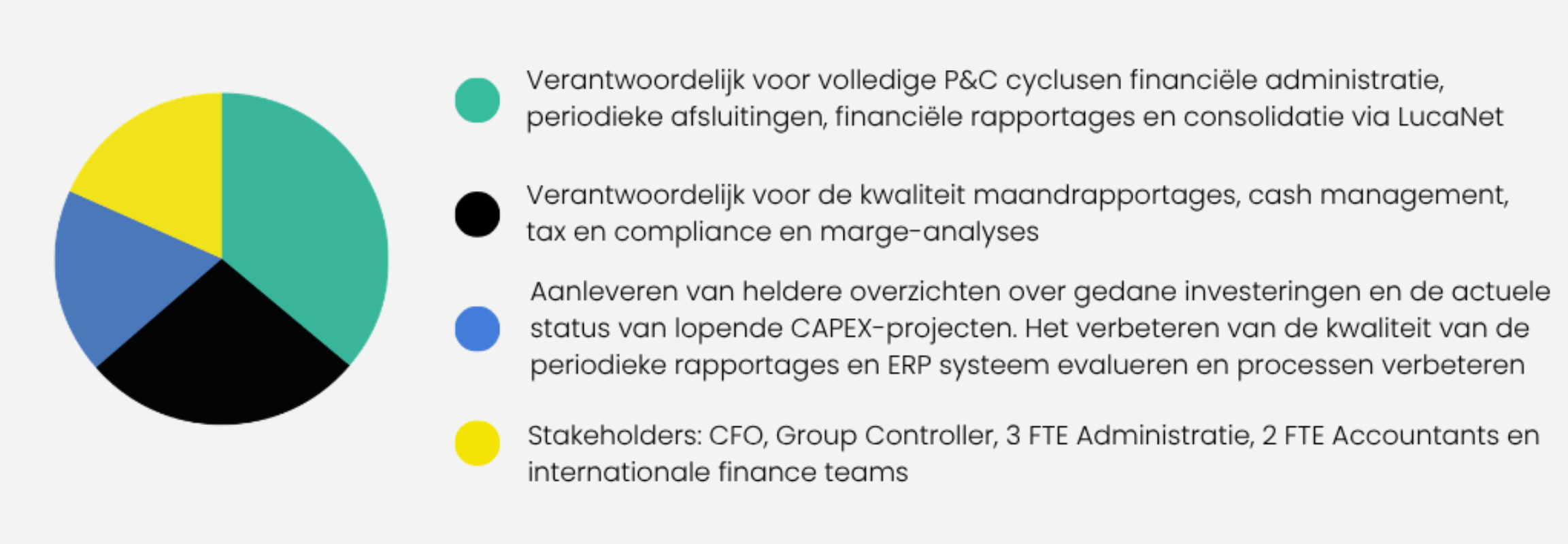 Vanuit het kantoor in Sliedrecht geef je leiding aan een klein team. Je weet hen mee te nemen in de veranderingen waar de organisatie doorheen gaat en zorgt voor betrokkenheid en ontwikkeling binnen het team. Tegelijkertijd ben je inhoudelijk sterk betrokken: je stelt maandelijkse rapportages op en verzorgt de consolidatie in Lucanet, voert marge-analyses uit en monitort resultaatontwikkelingen. Ook analyseer en bewaak je OPEX- en CAPEX-ontwikkelingen en ben je verantwoordelijk voor cashmanagement, liquiditeitsplanning en cashflow forecasts. Daarnaast zorg je voor een goed lopend debiteuren- en crediteurenproces, inclusief de controle op creditcardtransacties.