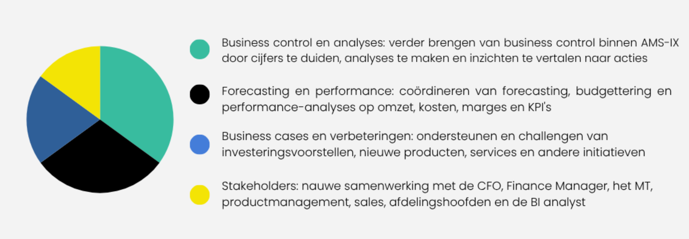 Interessant aan deze rol is de combinatie van inhoud en zichtbaarheid. Je werkt niet alleen aan forecasting en analyses, maar zit ook dicht op business voor nieuwe producten en services in een organisatie die nadenkt over de volgende groeifase. Omdat business control nog relatief nieuw is binnen AMS-IX, krijg je veel ruimte om de rol zelf vorm te geven. In combinatie met de korte lijnen, de inhoudelijk sterke omgeving en het directe contact met het MT, product management en sales maakt dat dit een mooie stap is voor iemand die wil bouwen én invloed wil hebben.